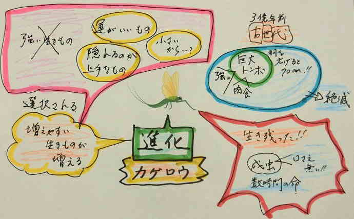 B 例えば、3億年ぐらい前の古生代(恐竜が誕生する前の時代)に、羽を広げると70センチのトンボがいました。これは肉食で強かったのですが、あっさり絶滅しました。では、どういうトンボが残ってたかというと、例えば蜻蛉(カゲロウ)です。成虫になったら、数時間しか生きられない命です。あまりにも短いから、口すらないんです。そんな一見弱そうな生き物が生き残っていて、幅70センチあるトンボは絶滅してしまいました。たまたまその条件で生き残れるものが生き残れたのです。