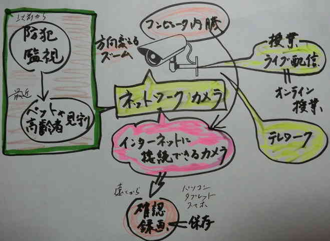 A ネットワークカメラは、遠隔地(離れた場所)からスマホでカメラの映像を確認したり、インターネット経由で録画データの保存ができたりします。映像を観るだけでなく、パソコン・スマホ・タブレットなどから操作して、撮影する方向を変えたりズームしたりすることも出来ます。お店の場合、万引きがないかどうかを離れた場所からスマホなどで監視できます。