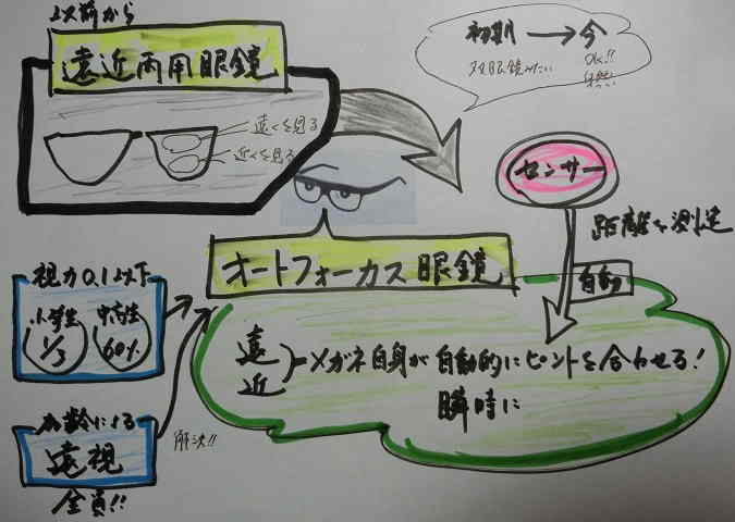 @ 遠近両用眼鏡は、1枚のレンズの中に「遠くを見やすくする部分(上半分)」と「近くを見やすくする部分(下半分)」が組み込まれているメガネです。それに対して、オートフォーカス眼鏡は遠くも近くもメガネ自身が自動的にピントを合わせます。この眼鏡は、センサー(感知器)が自動的に距離を測り、瞬時にレンズの太さを変化してピントを合わせます。