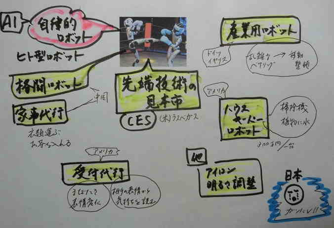 B この他、掃除機をかけたり、植物に水をやったりすることができる「ハウスキーパーロボット」(一台300万円:アメリカ)が紹介されていました。その他にも、衣類の素材や形を認識して自動でアイロンをかけるロボット、室内にいる人の体調や気分にあわせて電気の明るさや色を調整する機器など、AIを活用した技術が数多く展示されていました。ただ残念だったのは、日本の企業からの展示がほとんど見られなかったことです。世界に後れを取っているこの分野、今後の奮闘が望まれます。