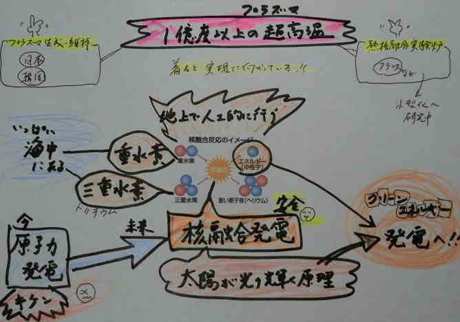 @ 太陽が光り輝いている原理(=仕組み)は、太陽の中心部で水素の原子核どうしが核融合して(くっついて)、ヘリウムに変わっているからです。この原理を利用して発電しようというのが「核融合発電」です。核融合発電は、太陽が熱と光を発すると同じ現象を地上で人工的に起こし、膨大なエネルギーを取り出す「次世代のクリーンエネルギー」と言われています。現在の原子力発電で使われる「核分裂」は、重い原子核(ウランなど)を割ることでエネルギーを出しますが、核融合はくっつける反応であり、仕組みが根本的に異なるのです。