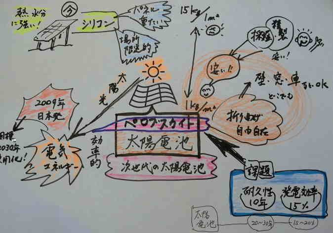 B このようにペロブスカイト太陽電池は、これまでの太陽電池に比べて活用が広く、低コスト(安い)で製造できる画期的な太陽電池です。ただ、現時点では耐久性が約10年(太陽電池は20年〜30年)、発電効率15%(太陽電池は15%〜20%)ですので、今後の更なる研究の加速が期待されています。