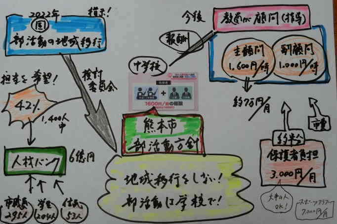 @ 部活動を巡って、やりがいを感じる教員と、否定的な教員と、教員は二分化しています。そんななか、熊本市は新しい試みを始めます。2022年、国が「部活動の地域移行」に向けた方向性を示すと、熊本市教育委員会は同年12月に「熊本市部活動改革検討委員会」を立ち上げました。10回の審議を経て、最終案を公表しました。骨子は「地域移行はせずに、学校で部活動を継続する。」です。