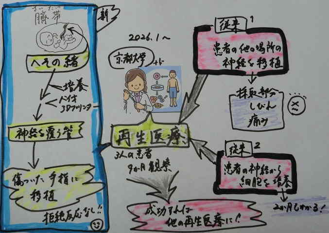 @ 京都大などのチームは、へその緒(さい帯)を使って、手指の末梢神経が傷ついた患者を治療する治験を2026年1月に始めました。さい帯の細胞を培養し(=増やし)、立体的に組織を作る「バイオ3Dプリンター」で神経を覆う管を作製し、傷ついた部分に移植するという画期的な方法です。