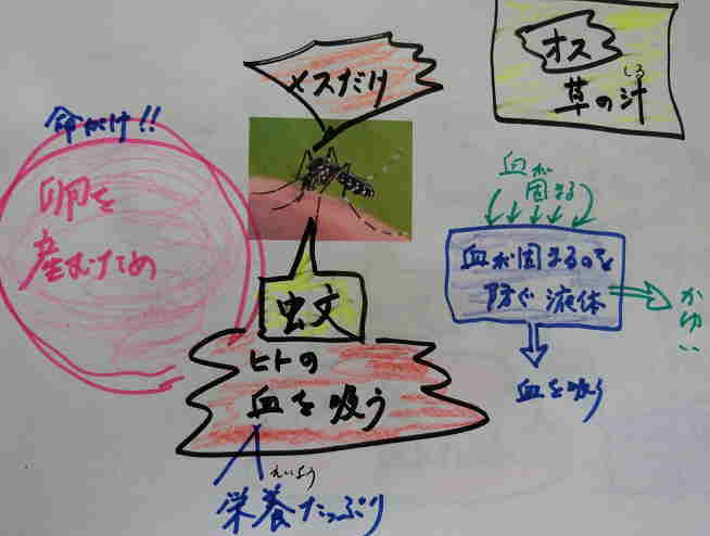 B なお、人間の血を吸いに来るのはメスだけです。オスは草の汁を吸って生きています。メスが人間の血を吸うときは命がけです。いつ殺されるか分かりません。なぜ命がけで血を吸いにくるのか? それは、卵を産まないといけないからです。そのためには栄養たっぷりの人間の血が必要なのです。