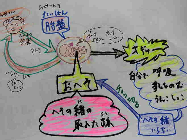 @ 「おへそ」は、赤ちゃんのときの「へその緒」の取れた跡です。へその緒の長さは約50センチ、太さは2センチで、赤ちゃんがお母さんのお腹の中にいたときには、お腹の中の胎盤(=赤ちゃんがお母さんのお腹で過ごす場所)につながっています。