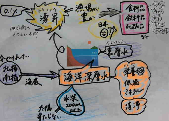 A この湧昇が起こると、表層の海水(表層水)に沢山の栄養が供給され、漁場が豊かになります。湧昇が起こる海域は全世界の海域のなかで、たった0.1%しかありません。しかし周りを海に囲まれた日本には、いくつもその湧昇地点があります。この海洋深層水は海の表面を流れている「表層水」とは異なり、きわめて清浄な(きれいな)海水です。これを活用して、さまざまな食料品・飲料品・化粧品などが生産されています。