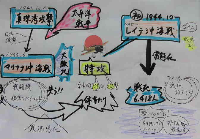 @ 1941年(昭和16年)12月8日、日本軍の真珠湾攻撃を皮切りに「太平洋戦争」が始まりました。当初は戦果を挙げていた日本軍も、1944年(終戦の前年)6月、マリアナ沖海戦で400機に及ぶ戦闘機と優秀な搭乗員(パイロット)を失い、大敗北を喫しました。これを機に戦闘機の激減、ベテランパイロット戦死による戦闘機の操縦技術低下が大問題になりました。そこで、大きな戦果をあげるためには「体当たり攻撃」(特攻)しかないという声が、指令部の中で上がり始めていました。