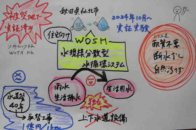 A 水を運ぶために必要な水道管の耐用年数は、40年程度です。すでに各所で水道管の取替工事が必要になってきています。ところが、配管費用は1kmあたり約1億円もかかります。全国の各市町村では、水道事業の工事費が大きな課題となっています。ところで、ソフトバンク株式会社とWOTA株式会社は、すでに災害現場に出かけてこのシステムを実践してきており、被災者に喜んでもらっています。そして今回、2024年10月から仙北市で「小規模分散型水循環システム」の実証実験を開始しました。