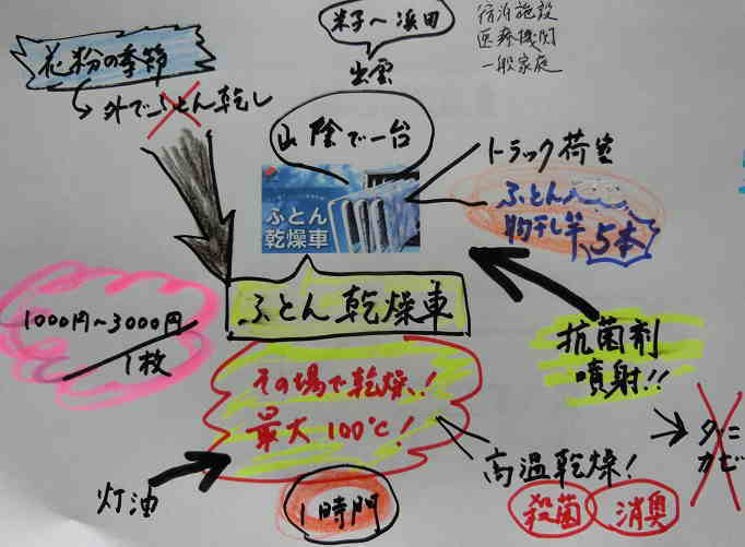 @ 春は心地良く眠ることができる季節ですが、花粉の季節でもあります。このいい季節に外に布団を干せない悩みを抱える人は少なくありません。そうした中、出雲市の寝具メーカーが提供する移動式の「ふとん乾燥車」が注目されています。トラックの側面には「その場で乾燥!最大100℃!」という文字が大きく書かれています。山陰地方ではたった1台しかないというこの特別な車両が、宿泊施設や一般家庭の布団を “ふわふわ” に生まれ変わらせています。