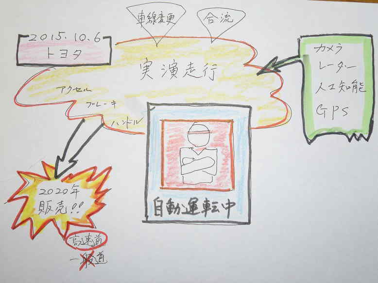 @ この度(2015.10.6)、トヨタが「自動運転」の実演走行(実際に自動運転で走るところを見せる)を東京の首都高速道路で行いました。そして、運転手が自動運転ボタンのスイッチを押すと、自動車は勝手にアクセルをふかしたりブレーキを踏んだりハンドル操作をしたりして、人が運転しているかのように見事な走行を披露しました。